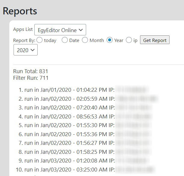 In the section “Reports” you can see the short analysis about how many times your application has been run. Including the date and time and the IP number of the user, with the ability to choose a specific date, month, or year.